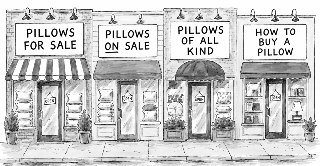 Imagine you’ve just gotten out of bed one morning. You’re groggy because you’ve had a terrible night’s sleep. Also, your neck is cramped and sore from lying on one side for too long. You went over budget on a new mattress just last month, so it must be your old pillow that’s responsible for the bad slumber. Now, imagine you’re walking down Main Street, and you see 4 stores, each advertising its wares. If you could only go into one store, which one would it be?